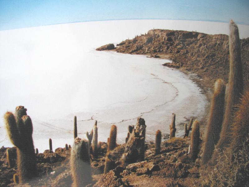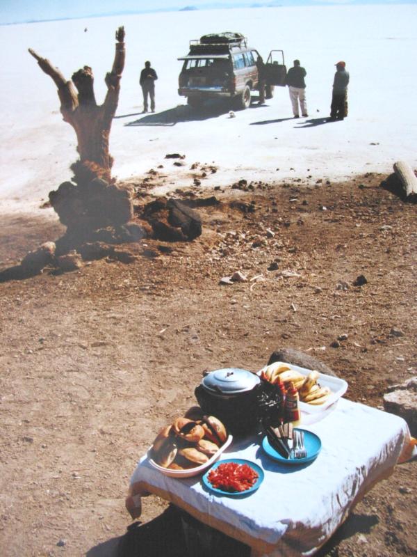 Wow, wat een landschap. Een witte woestijn vol witte zouthoopjes en luchtspiegelingen. Zonder zonnebril zie je helemaal niets en navigeren kan alleen op basis van de bergen aan de horizon. We zijn nu bij het beroemde zouthotel. Het is dus helemaal van zout gebouwd, inclusief de meubels. Het is overigens niet meer in bedrijf vanwege vervuilingsproblemen. We reizen met een stoere Toyota Landcruiser en de groep bestaat uit 6 man, plus een chauffeur en kokkin. Een Zwitsers stel, Manu en Zelline, de australische Richard, de franse Gwen en wij. Allemaal jonge mensen en een leuk groepje, het klikt. Gwen spreekt ook Spaans en is daarmee ons communicatiemiddel met de Bolivianen. Het tempo is lekker laag en we stoppen vaak. We krijgen alle tijd om rond te kijken en iedereen lijkt tevreden en relaxed. We zijn pas twee uur onderweg, maar ik vind het nu al een heel plezierige trip. We zijn vanmorgen wel gewaarschuwd voor de venijnige kou ’s nachts, maar hier zijn we op voorbereid, warme kleren en dikke, dubbele slaapzakken. We hebben vanmorgen nog even door Uyuni rondgelopen. Best aardig dorp voor een dag en zo te zien is het behoorlijk welvarend. Het is er wel stil en koud, we hebben ons thermo ondergoed aangetrokken en zelfs in de zon is het niet heel warm.