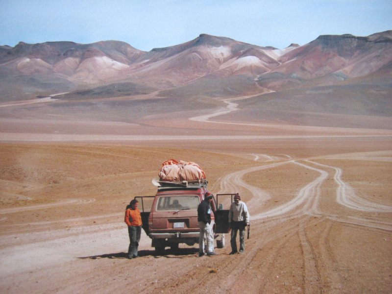 Laguna Colorado, de gekleurde lagune. Dat klinkt vrolijk en exotisch, bijna tropisch. Niets is minder waar. Aan de voet van een besneeuwde berg ligt een verzameling keetjes met metalen daken. Er steken wat hoge radiomasten omhoog en een grote schotelantenne is op het noorden gericht, de richting waar vanaf dit punt op de aardbol de geostationaire communicatie satellieten hangen. Er staat een harde, gure wind en zonder muts, handschoenen en sterke zonnebril kan je je beter niet buiten wagen. Stromend water is er niet en elektriciteit alleen gedurende een paar uur. Er is wel internet wanneer ze een straalverbinding met La Paz opzetten, tegen astronomische prijzen natuurlijk. Al met al lijkt het net of we op een zuidpool basis zijn aangekomen. De witte zouthopen zijn net ijsbergen, alleen de pinguïns hebben een eigenaardige roze kleur en lange steltpoten die de verkeerde kant opbuigen. Om 18:00 uur is het diner, we hebben dus nog een paar uur om onze gezellige omgeving te verkennen. Het stuk van Laguna Hedona tot hier was net een scène uit de film Mad Max. We scheurden door het stoffige niets, terwijl parallel aan ons in de verte af en toe een collega landcruiser in een stofwolk voorbij kwam. Dit maanlandschap bevond zich op 4500 meter hoogte en elke heuvel waar we langs reden was hoger dan de hoogste alpentop, de Mont Blanc. De echte bergen die voorbij schoven staken bijna zes kilometer de hoogte in en markeren de grens met Chili. Dit is echt de meest afgelegen plaats waar ik ooit ben geweest geloof ik, prachtig.