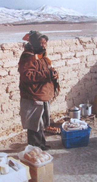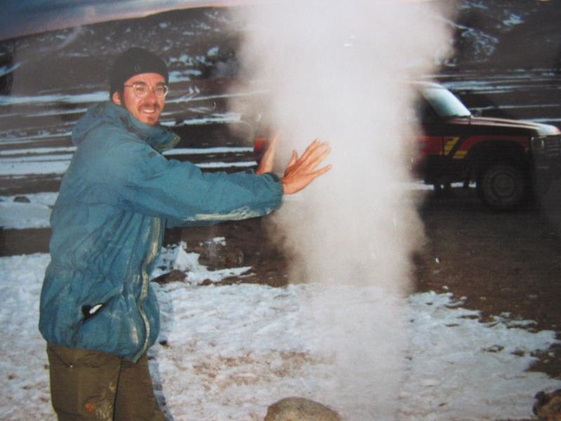 Allemachtig wat is het koud en allemachtig wat is het mooi. Gwen en Richard liggen in de bron terwijl het nog vriest. Ik wilde eigenlijk ook, maar kan niet bij mijn rugzak met handdoek onder het zeildoek op de landcruiser, naja, zo graag wil ik nou ook weer niet. We bevinden ons in een ijs en sneeuw landschap op ongeveer 5000 meter hoogte, hoger dan de Mont Blanc. Vulkanen, geisers, borrelende modder, stomende gaten en warme baden. En er zijn geen mensen en het is ijs- en ijskoud. Gelukkig is de kokkin wat warms aan het maken. Petra houdt niet van kou en niet van vroeg in de ochtend. Ze sputtert en moppert en heeft allerlei probleempjes, ze wil naar huis. Gaat wel weer over als het ophoudt met vriezen (Petra: Hij bedoelt na het ontbijt of een kop koffie, want drie uur ’s morgens zonder iets is wel een beetje lang). Ah, ontbijt.