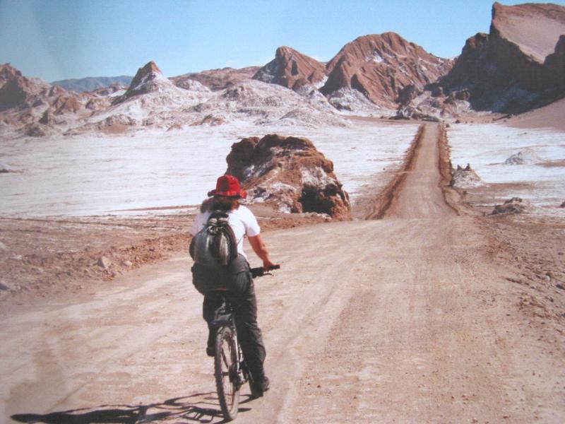 Tjee, wat is het hier stil. Geen verkeer, geen vogels, geen wind, helemaal absoluut niets. Je hoort de stilte in je oren piepen. Dit is wel weer kicken, met een mountainbike over de verlaten woestijnwegen met de besneeuwde toppen van de Andes op de achtergrond. Maar toen het asfalt overging in gravel en de weg begon te stijgen, ging het kicken over in stevig zweten. In de felle woestijnzon. Toch is het maar 18 graden in de schaduw.