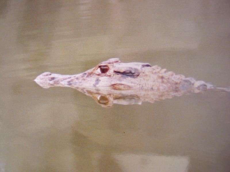 We varen op een nevelig meer op een primitieve houten catamaran (twee kano’s met een vlot erop). In de verte klinkt van misthoorns alsof er een groot schip onze kant opkomt, bizar. Maar het zijn geen misthoorns, maar brulapen die hun territorium afbakenen. We zijn op zoek naar de reuzenotters. De zon schijnt nevelig door de mist en iedereen is doodsstil. Het enige geluid is dat van de vogels, de krekels en het zachte geplons van de roeispaan in het water. Tot nu toe nog geen otters, maar wel een kaaiman, die ons kil ligt aan te staren met z’n snuit net boven de waterspiegel.