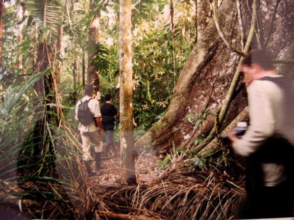"Gringo, gringo!" Een paar ondeugende indiaantjes riepen ons na, in de stoffige straatjes van Paucartambo, het laatste dorp voor de jungle. We hadden al uren voortgeploeterd over de stoffige bergwegen van de Andes. De bevolking is hier bijna helemaal indiaans en hier lopen ze echt in klederdracht lama’s achter zich aan te slepen. Na de lunch in Paucartambo reden we verder richting Manu en na een paar uur kwamen we bij de laatste pas. Diep onder ons lag het Amazonebekken en zelfs de Amazone zou zichtbaar moeten zijn, wanneer er niet een dik wolkendek onder ons lag. Via een onmogelijk klein modderig pad reden we langs enorme afgronden en dwars door watervallen. Regelmatig moest de truck een paar keer steken, omdat de bochten te scherp waren of omdat er stukken weg waren weggeslagen. Ik moest aan de briefing denken van gisteravond, waar we een verklaring moesten ondertekenen dat we ons ervan bewust waren dat we dood konden gaan bij het bezoeken van dit soort afgelegen plekken. Marianne relativeerde het door te vertellen dat deze verklaring speciaal voor Amerikanen was. Maar toch ging het door mijn hoofd toen de truck weer een keer scheef boven een peilloze afgrond hing. Maar we leven nog. Sterker, we zitten op ons bed onder een rieten afdak te luisteren naar de geluiden van de jungle om ons heen, terwijl er net een regenbui losbreekt. Officieel is dit nog het nevelwoud, op 1600 m., dus nog comfortabel qua temperatuur en muggen. Het is natuurlijk wel supervochtig en de klamheid is overal. De eerste kennismaking was een korte hike naar de campground. Met halverwege een bezoek aan een observatie hutje voor de "cock of the rock", de felrode nationale vogel van Peru. We zagen er inderdaad een stuk of 10, herrieschoppende grappige vogels.
